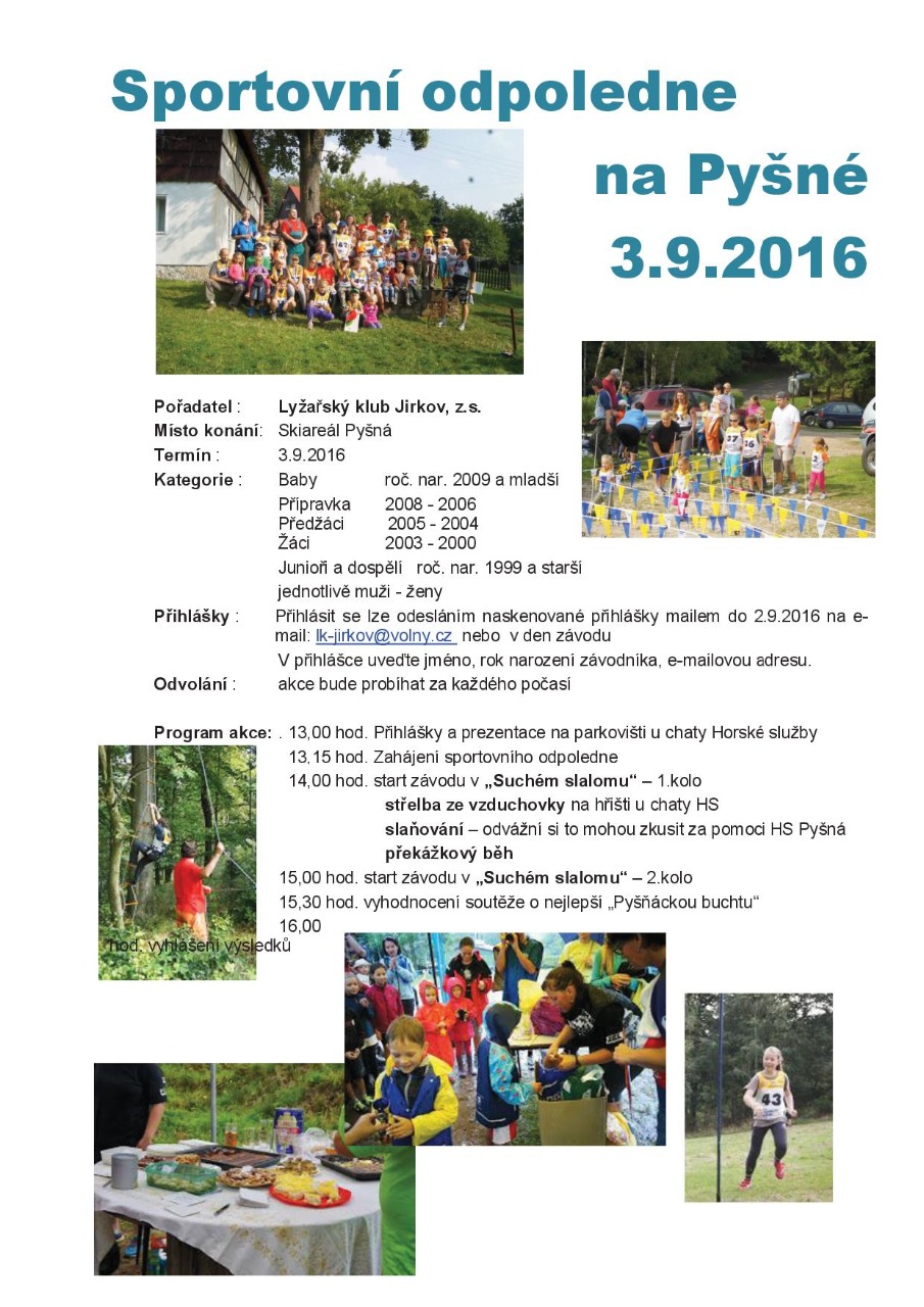 Za pěkného slunečního počasí uspořádal v sobotu 31.8.2013 Lyžařský klub Jirkov tradiční sportovní odpoledne na Pyšné. Tato akce se uskutečnila již po páté a každým rokem získává více příznivců. Letos se zúčastnilo skoro 50 sportovců. Nejmladšímu účastníkovi závodu byly dva roky, nejstaršímu...